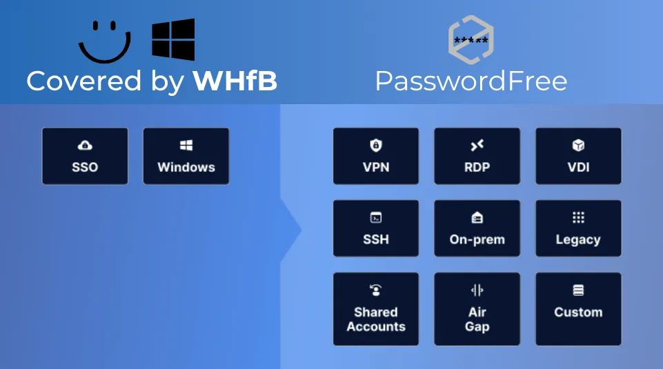 Go beyond just Windows and SSO. Make every system in your environment password-less and more secure – even legacy, on-prem, shared logins, and air-gapped systems.