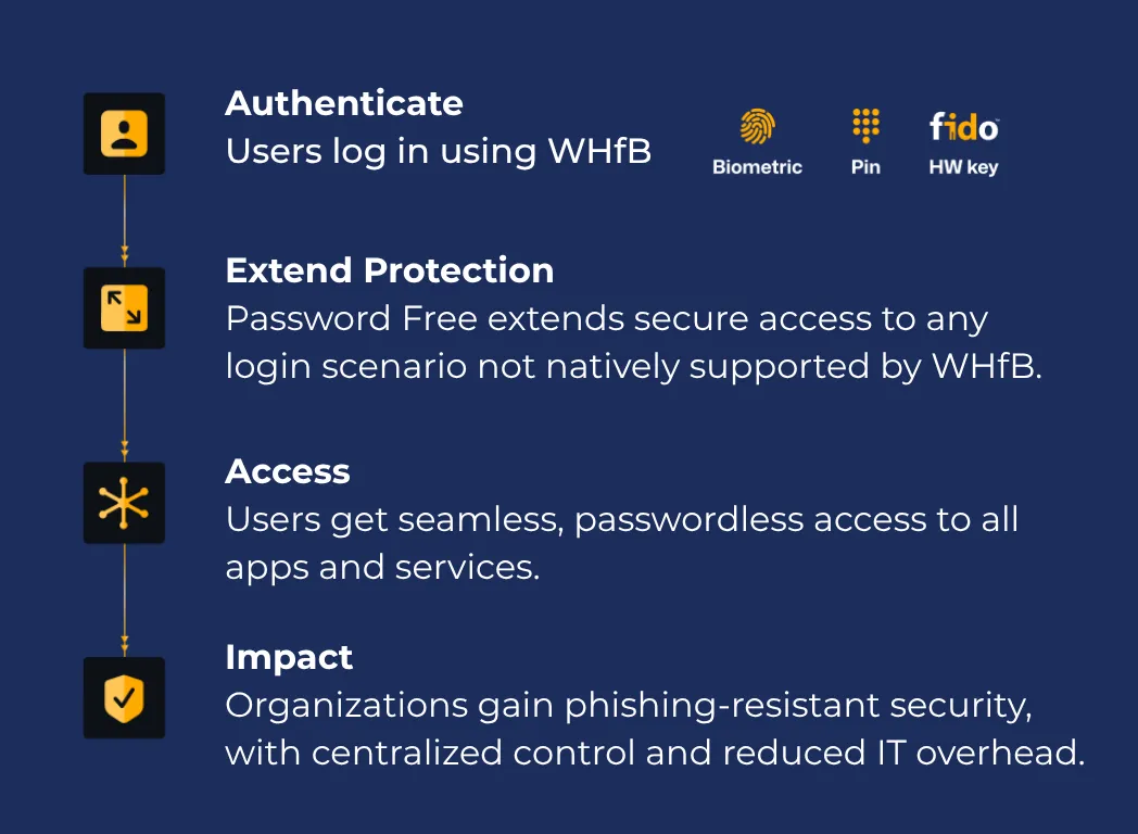 Password Free is an easy-to-deploy SaaS identity solution that securely eliminates user passwords with a modern, phishing-resistant MFA — even in legacy, on-prem, and air-gapped environments.